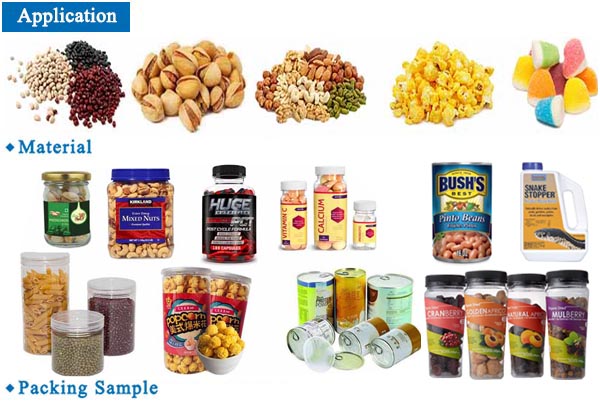 Full automatic granule bottles weighing filling capping and labeling lines(LFZX-SC-10), Scope of application: granular and solid materials such as nuts, beans, peanuts, snacks, cashew, sugar, rice, beans, condiments, washing powder, feed, desiccant, plastic pellets, grains, etc.